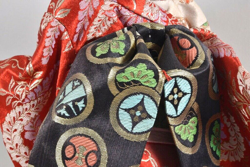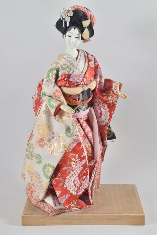 Puppe Skulptur Geisha Japan, auf Holzsockel, verschiedene Materialien u.a. Seidenstoff, ca. 1970, 42 x 24 x 20 cm