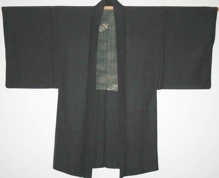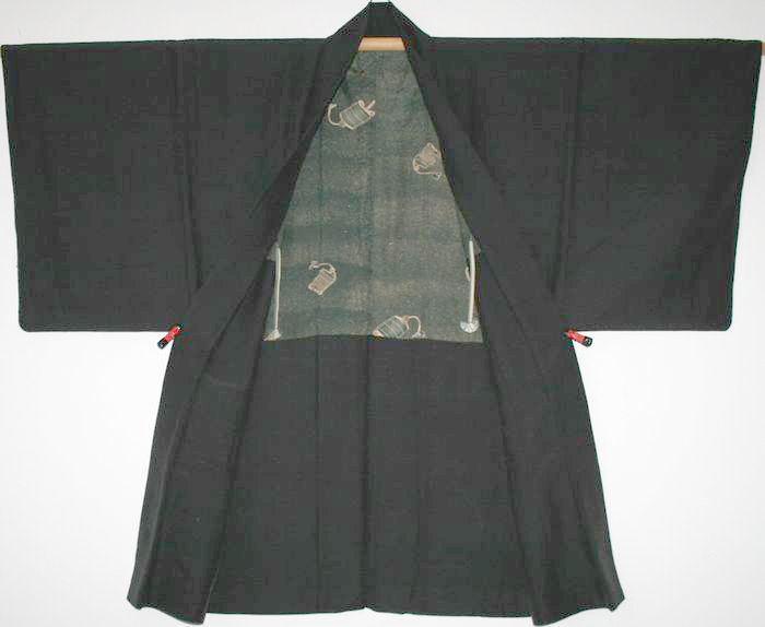 Kimono Seide schwarz, Mitte 20. Jahrh., Japan, green pilbox Motiv, 64 xl