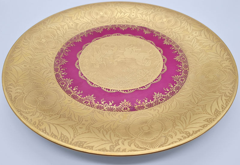 Josef Kuba, DW Karlsbad, Streitwagen, Platzteller, rot und 22 karat Goldätzung , glasiertes Weißporzellan, Bodenmarke, D : 29 cm